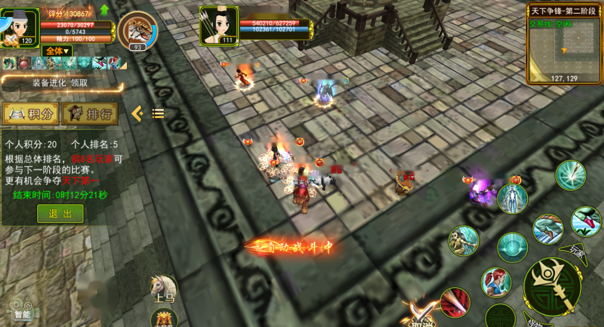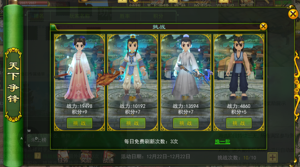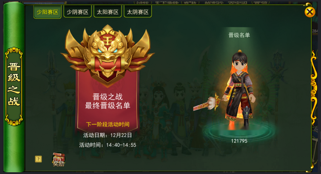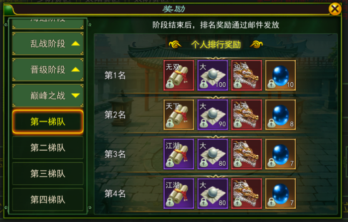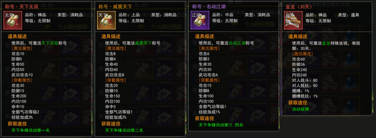 在这偌大的江湖,派系林立。在维护江湖稳定的同时,也有些侠者愿追求武之极致,邀约名门侠士比试,以精进自身武学路数。最终胜者,将是武林一代传奇!江湖上掀起一波热潮,各路豪杰纷纷摩拳擦掌备战这场盛世之战! 天下争锋 「天下争锋」为跨服对战玩法,全服将划为四大战区。豪杰们经过层层挑战,最终的王者将获得江湖授予的称号「天下无双」(穿戴属性含「全部气功等级+2」等强力属性)及特殊坐骑「金龙」,金龙在幻化状态时激活龙吟四海、神龙摆尾特技。 ![]() 极品奖励一览 ![]() 金龙骑乘状态 玩法介绍 海选阶段 海选阶段持续三天,所有满足参与条件的少侠(60级及以上)将自动报名比赛。 少侠们可自由选择对手进行对战。进入副本后由系统自动战斗,无法手动操作及使用药品。挑战胜利将获得对应积分,挑战失败扣除积分。被挑战者积分不变。 每日拥有10次挑战机会(可根据需要额外购买10次)。若对手都较强大,可选择换一批对手,每日免费刷新3次。 ![]() 海选结束后将公布晋级名单,晋级的玩家可参与下一阶段比赛。 Tips:阶段结束后,根据个人排行情况可获得数量不等的武勋丹、金条、幸运符。只要积极参与挑战,还能获得大量武勋丹、银两。记得前往「目标奖励」领取! 大浪淘沙 海选晋级名单中的所有玩家将分为四个梯队自动报名参与「大浪淘沙」。 活动开启后,少侠将根据提示随机传送至战场,各自为战进行一场酣畅的大乱斗!战场持续30分钟,击败的对手越多积分越高。 ![]() 战斗结束后所处梯队积分最高的8名玩家,进入绝顶之战! Tips:阶段结束后若积分相同,则按连斩数排名。该阶段根据个人排行情况可获得数量不等的武勋丹、金条、水晶符碎片。 绝顶之战 在该阶段中,每个梯队会按照1V1即时战斗的方式决出梯队最强者。最强玩家将代表所属赛区与其他赛区的最强者进行巅峰之战。 ![]() Tips:阶段结束后,根据个人排行情况可获得数量不等的武勋丹、金条、20%幸运符碎片。 巅峰之战 汇集四大赛区各梯队的最强者进行巅峰之战,最终决出各梯队的强者排名。最终王者仅展示第一梯队的最强者,展示将持续到下期活动开启。 Tips:巅峰之战结束后,第一梯队将获得极品限时称号、「金龙」坐骑(不同时限)、武勋丹、中级集魂石。其他梯队根据个人排行情况可获得数量不等的武勋丹、金条、中级集魂石。 ![]() |